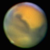 Mars ist der erste äußere Planet. Sein Licht erscheint uns leicht rötlich. Auf seiner Oberfläche lassen sich schon mit kleineren Teleskopen, Oberflächendetails wie seine Polkappen erkennen. Auch sieht man hellere orangefarbene sowie dunklere rötlichere Gebiete. Diese ändern auch im Laufe eines Marsjahres ihr Aussehen.